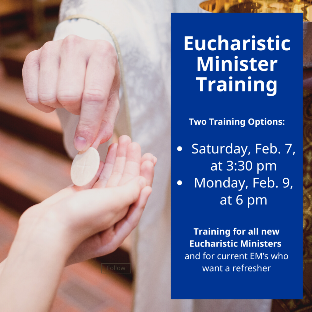 If you are interested in being a Eucharistic Minister of Holy Communion, or if you are currently a Eucharistic Minister but you haven’t served in a while and would like to be retrained on the process, please join us for one of our training session on Saturday, Feb. 7, from 3:30-4:30 pm or on Monday, Feb. 9, from 6-7 pm in the Church.